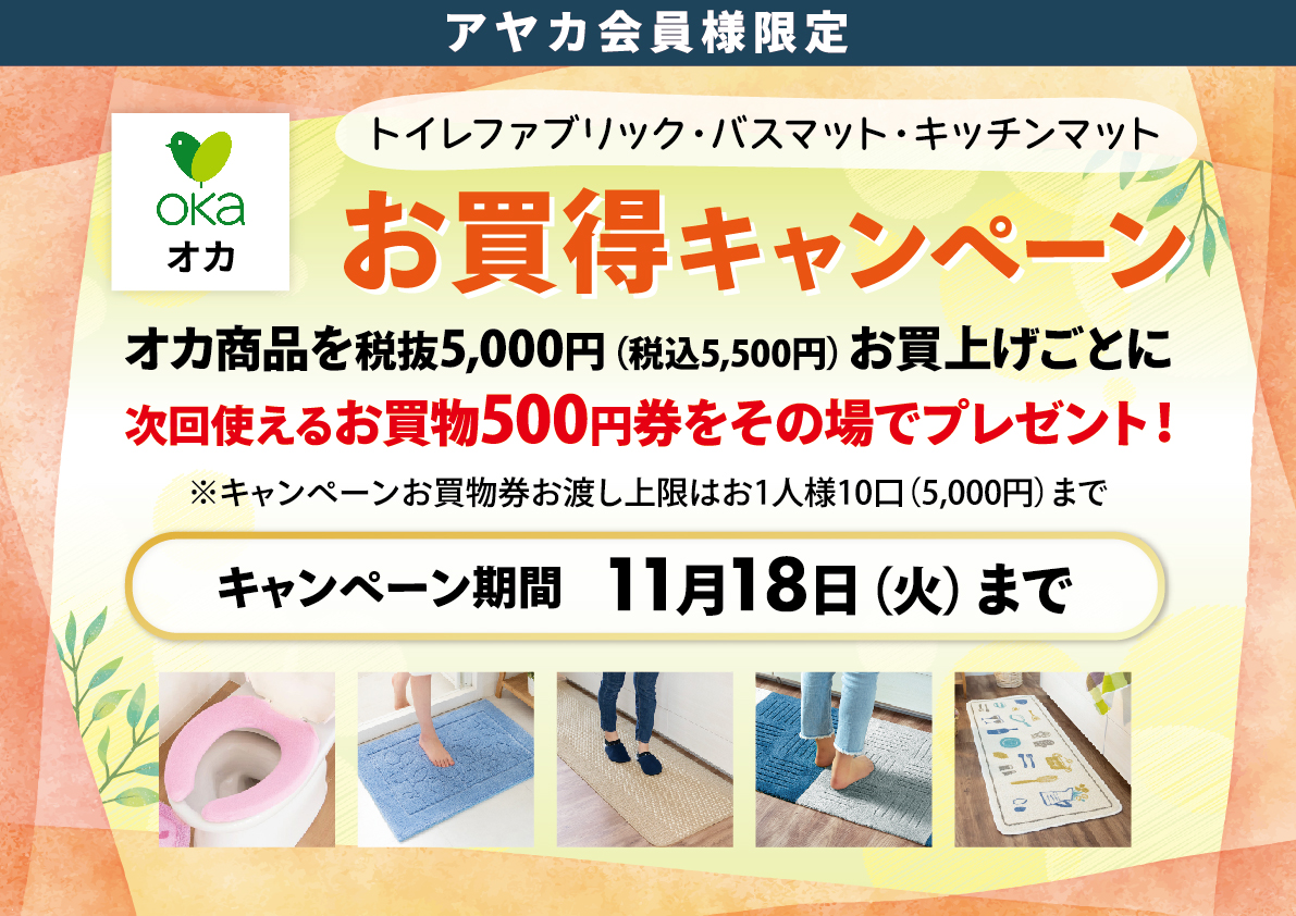アヤハディオ・ディオハウス・ディオワールド全店にて家庭用品【オカキャンペーン】を開催。 期間中に各店での1日のお買物で【オカ】製品を合計5,000円(税込5,500円)お買上げごとに、次回使える「お買物500円券」をその場でプレゼントいたします! ※キャンペーンお買物お渡し上限はお1人様10口(5,000円)まで 【キャンペーン期間】 2025年10月1日(水)~2025年11月18日(火)まで