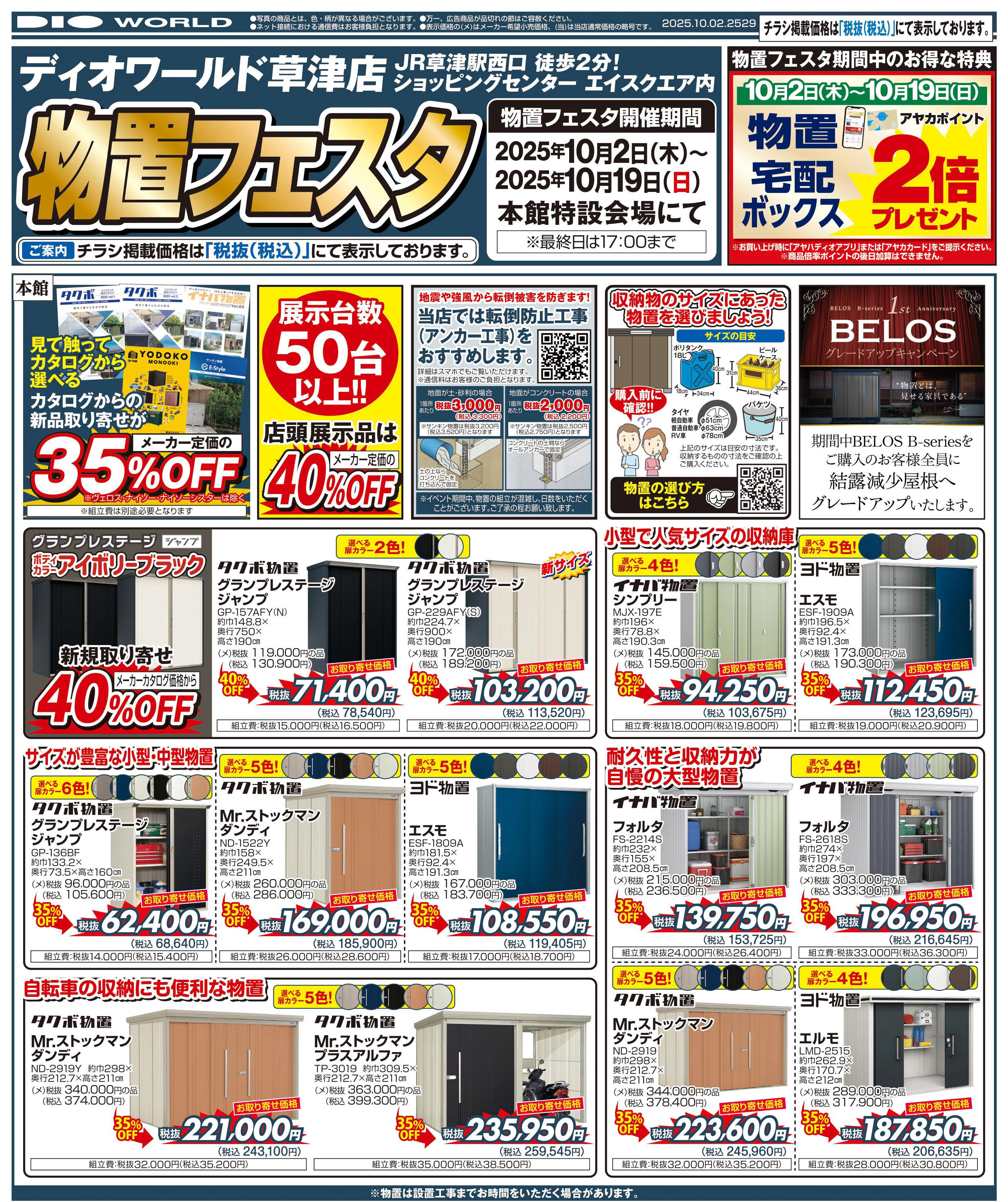 ディオワールド草津店にて、【物置フェスタ】を開催! 物置フェア特典として、 ①カタログからの新品取り寄せがメーカー定価の35%OFF! ※ヴェロス・ナイソー・ナイソーシスターは除く。 ②物置・宅配ボックスのアヤカポイントがいつもの2倍ポイントプレゼント! お買得なこの機会に皆様のご来店をお待ちしております! 【開催期間】 2025年10月2日(木)~2025年10月19日(日)17:00まで