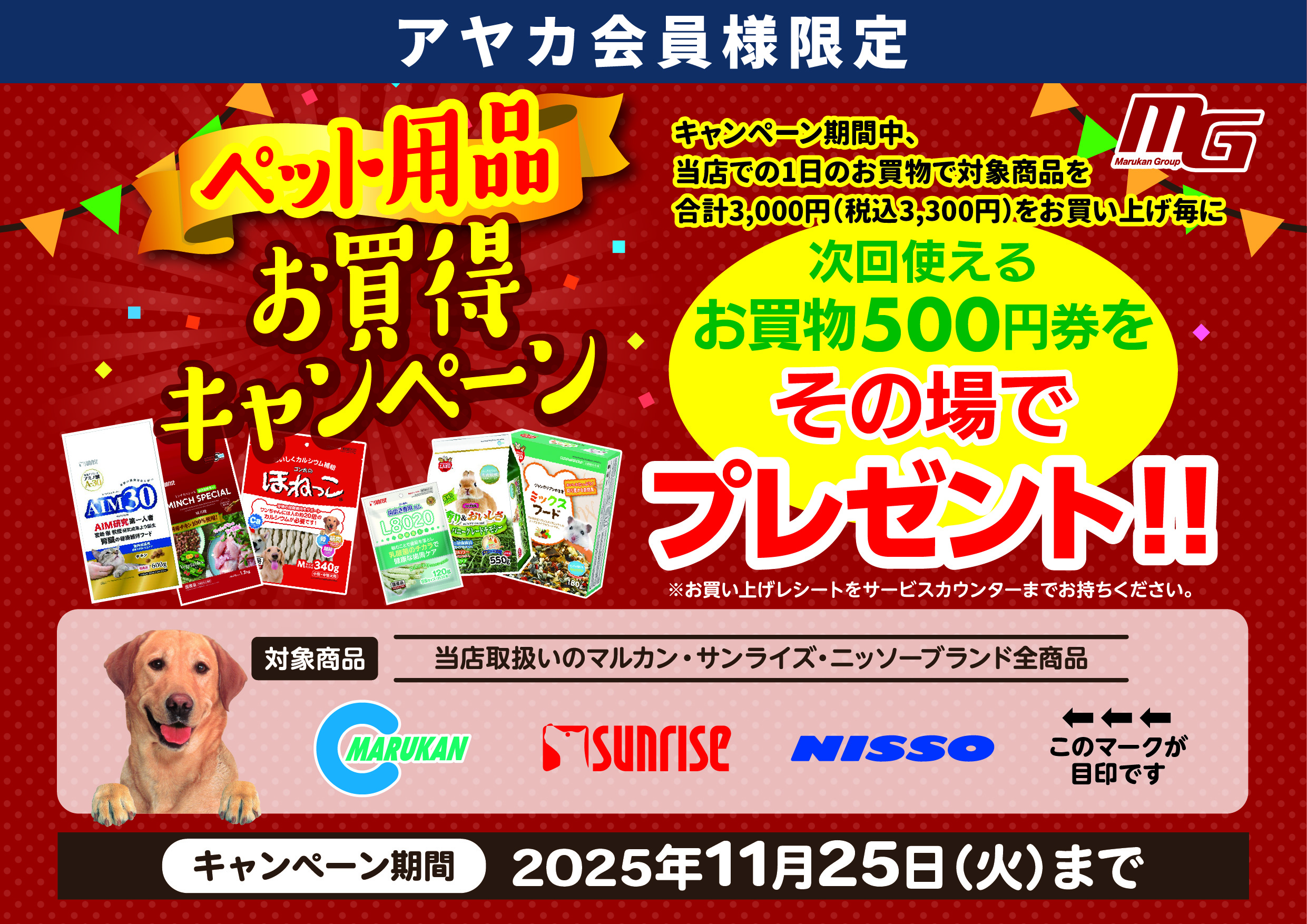 アヤハディオ・ディオハウス・ディオワールド全店にて【ペット用品お買得キャンペーン】を開催。 期間中に各店での1日のお買物で対象商品を合計3,000円(税込3,300円)お買上げ毎に、次回使える「お買物500円券」をその場でプレゼントいたします! 【対象商品】当店取扱いのマルカン・サンライズ・ニッソーブランド全商品 【キャンペーン期間】 2025年10月15日(水)~11月25日(火)まで