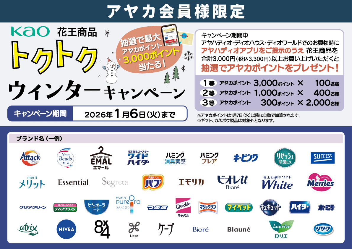 キャンペーン期間中に各店でのお買物時、アヤハディオアプリをご提示いただき、【花王商品】合計3,000円(税込3,300円)お買上げいただきますと、「抽選でアヤカポイント」をプレゼントいたします!