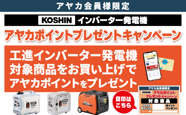 【KOSHIN】インバーター発電機 アヤカポイントプレゼントキャンペーン 工進インバーター発電機対象商品をお買い上げでアヤカポイントをプレゼントいたします。 期間:~2026年1月27日(火)まで