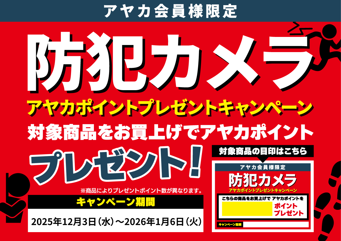 防犯カメラ ポイントプレゼントキャンペーン 対象商品をお買い上げでアヤカポイントをプレゼントいたします。 ※商品によりプレゼントポイント数が異なります。 キャンペーン期間: ~2026年1月6(火)