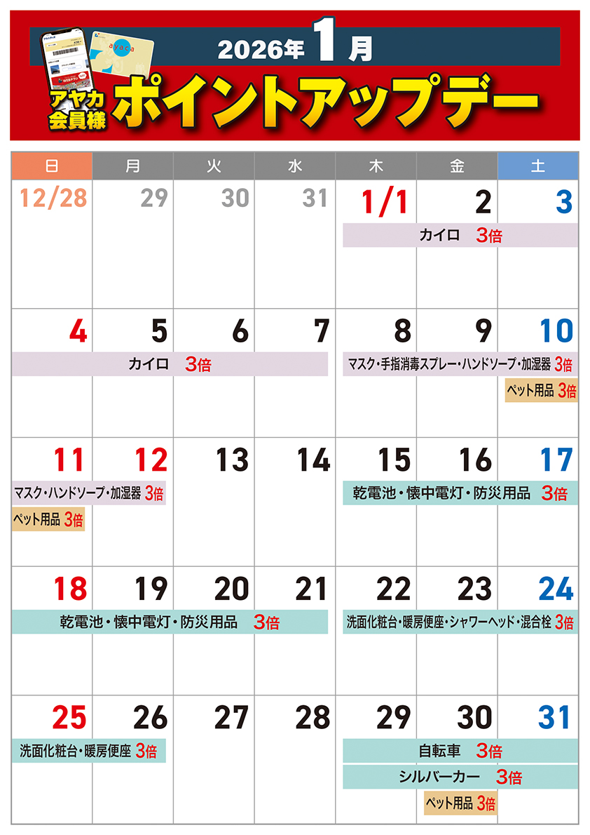 1月のポイントアップデー アヤカ会員様がお得にお買い物ができる「ポイントアップデー」 お買い上げ時、レジにて「アヤハディオアプリ」または「アヤカカード」をご提示で下記商品のポイントがアップ! ぜひお得なアヤカ会員様ポイントアップデーをご利用ください!! ※商品倍率ポイントの後日加算はできません。