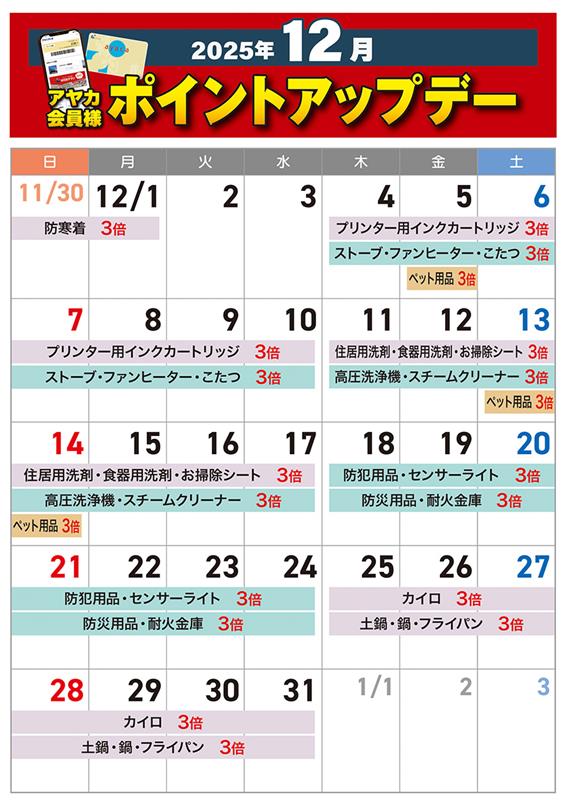 12月のポイントアップデー アヤカ会員様がお得にお買い物ができる「ポイントアップデー」 お買い上げ時、レジにて「アヤハディオアプリ」または「アヤカカード」をご提示で下記商品のポイントがアップ! ぜひお得なアヤカ会員様ポイントアップデーをご利用ください!! ※商品倍率ポイントの後日加算はできません。