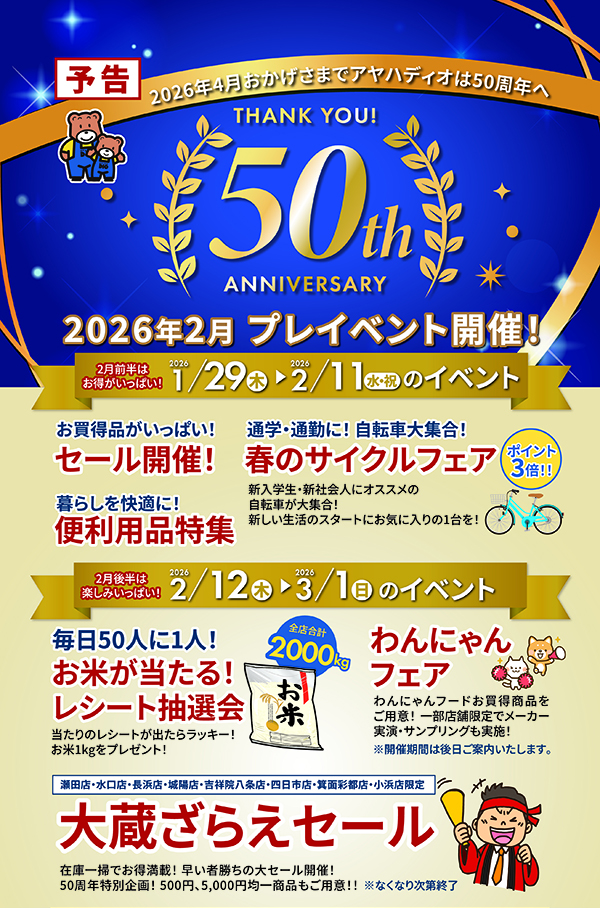 2026年4月、おかげさまでアヤハディオは50周年を迎えます。 日頃ご愛顧いただいておりますお客様へ感謝の気持ちをこめて、50周年のプレイベントを開催! 2026年1月29日(木)~2月11日(水・祝)の期間限定お買得品もご用意! お買得品はこちらからチェック! 2月12日(木)からのイベントもお楽しみに!