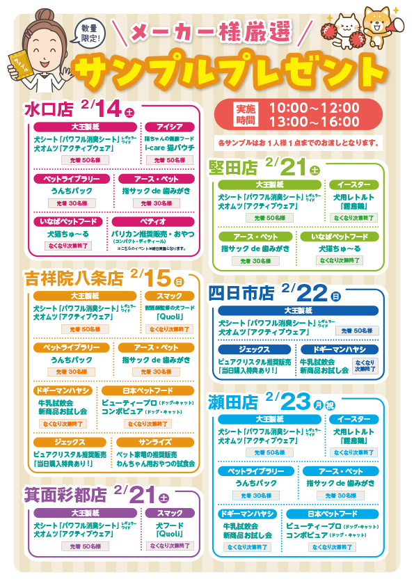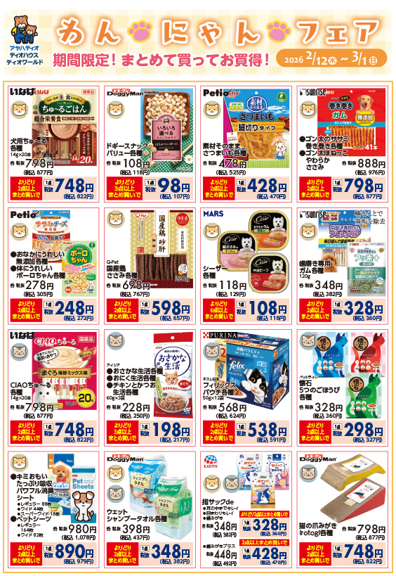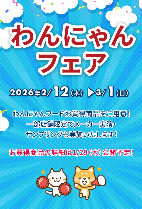わんにゃんフェア開催! 期間中、わんにゃんフードなどお買得商品をご用意いたしております! また、一部店舗限定で、メーカー実演・サンプリングも実施予定。 ぜひこの機会にご利用くださいませ。 期間:2026年2月12日(木)~2026年3月1日(日)
