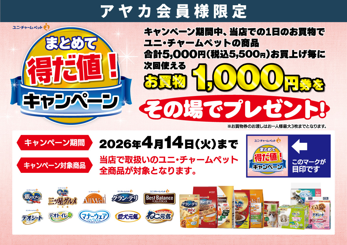 ユニ・チャームまとめて得だ値!キャンペーン 開催! 期間中、当店での1日のお買物でユニ・チャームペットの商品合計5,000円(税込5,500円)お買上げ毎に次回使えるお買物1,000円券をその場でプレゼントいたします。 お得なこの機会にぜひご利用くださいませ。 ■期間:2026年3月12日(木)~2026年4月14日(火) ※お買物券のお渡しはお一人様 最大3枚までとなります。
