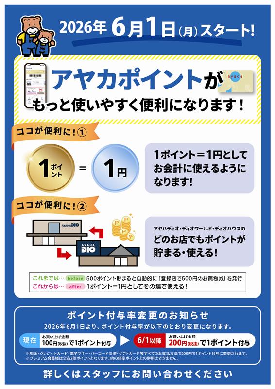2026年6月1日(月)よりアヤカポイントがもっと使いやすく便利になります! (1)1ポイント=1円としてお会計に使えるようになります! (2)アヤハディオ・ディオワールド・ディオハウスのどのお店でもポイントが使えるようになります! より使いやすく、より便利になったアヤカポイント、ぜひご活用ください!