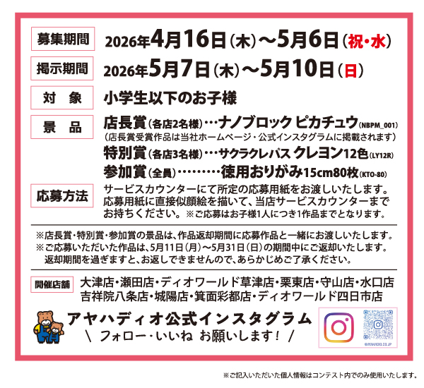 母の日似顔絵コンテスト 開催! 5月10日(日)は母の日。 お母さんの似顔絵を描いて、ありがとうの気持ちを伝えませんか? アヤハディオではお母さんの似顔絵を募集! 参加者全員にプレゼントをご用意しております。 さらに、店長賞、特別賞には豪華な景品も! みなさまのご応募お待ちしております。 応募用紙はこちらからダウンロードできます。