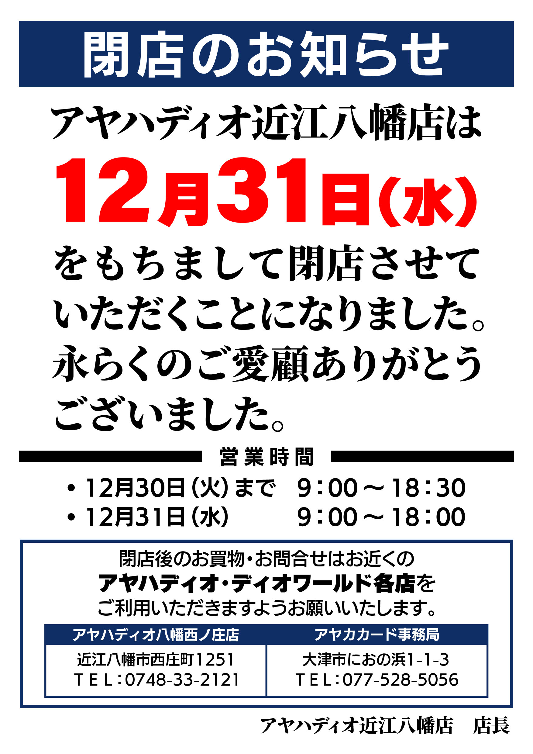 アヤハディオ近江八幡店 2025年12月31日(水)閉店のお知らせ